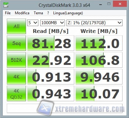 Il software fa registrare performance pari a 81.28 MB/s in lettura e 112 MB/s in scrittura in configurazione RAID 0 mentre in RAID 1 passiamo da 90.64 in lettura a 57,57 MB/s in scrittura.
