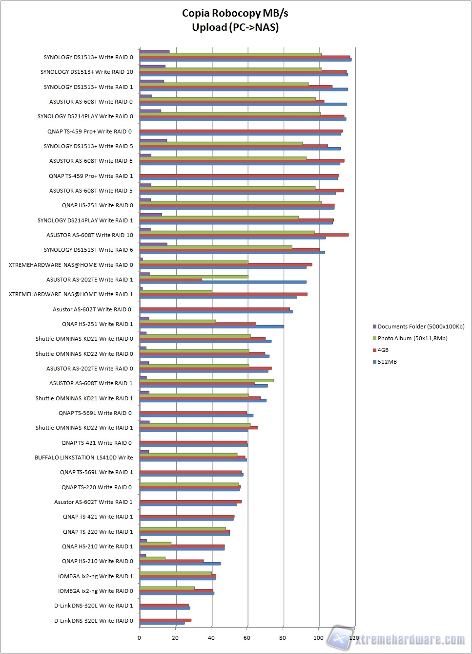 Per quanto riguarda l’upload entrambe le configurazioni fanno registrare valori simili facendo posizionare il prodotto a metà classifica, vicino ad altre soluzioni dual bay.