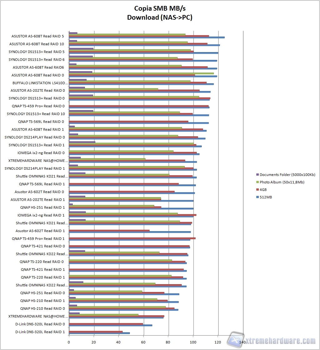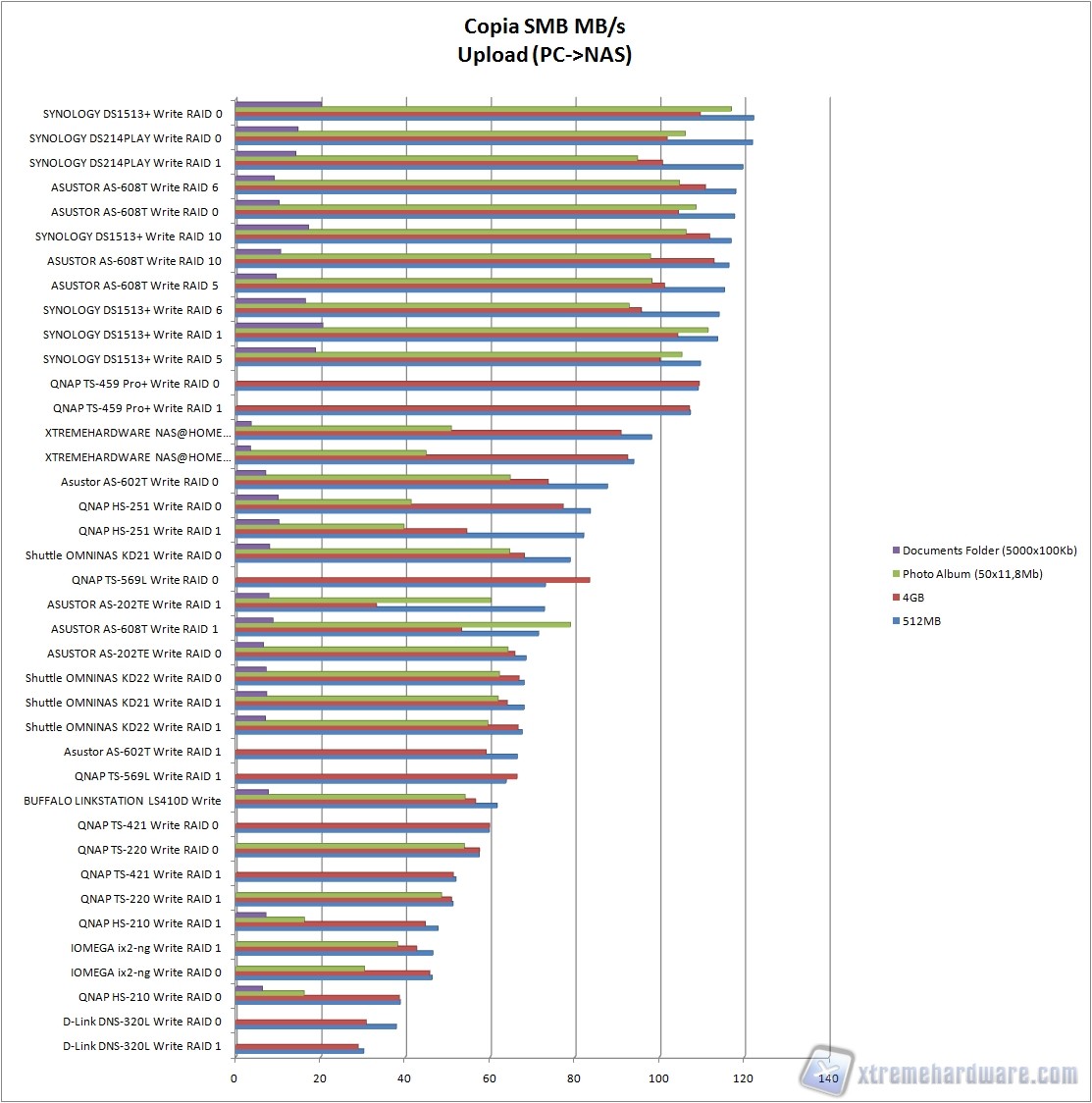 Effettuando il medesimo test ma con protocollo SMB ricaviamo risultati leggermente migliori in fase di download dati, dove l’HS-251 si posiziona a metà classifica raggiungendo i 100MB/s in configurazione RAID1.